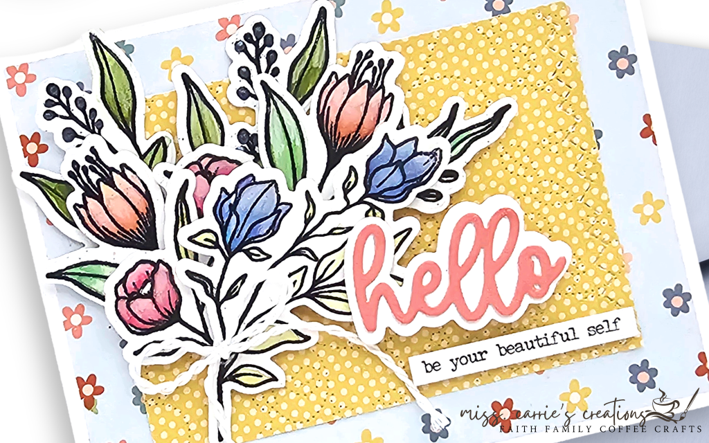 To complete the card, I layered the bundle of florals over some adorable pattern paper from the Boho Sunshine collection. I added a simple die-cut sentiment and a sticker phrase for an extra touch of charm.