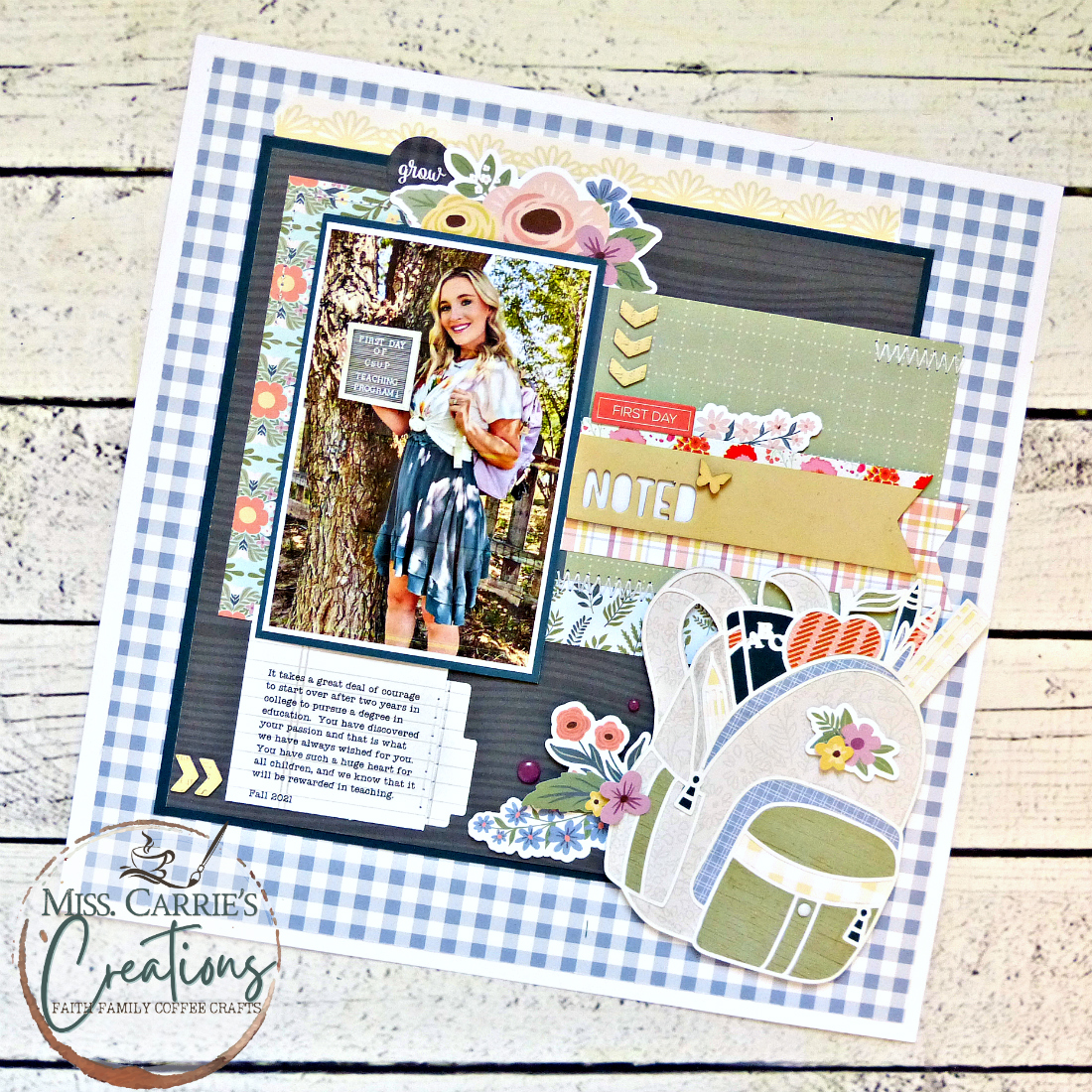 All of the elements on this page came together beautifully. The flowers, the die cuts, and the charming backpack complement the photo so well and allowed me to share the story of our daughter’s first day of school.