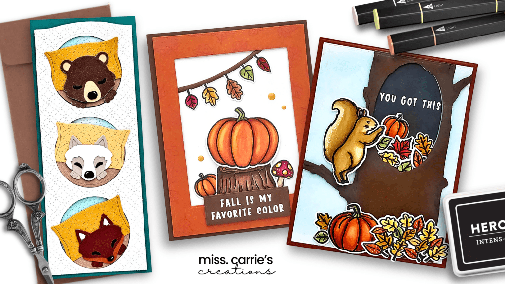 Today, I’m sharing three adorable autumn card designs using the Fall is My Favorite Card kit and the Cozy Critters Die Set of the Month. The sweet pumpkin scene, sleepy woodland critters, and an encouraging squirrel are all beginner-friendly designs that are perfect for the season.