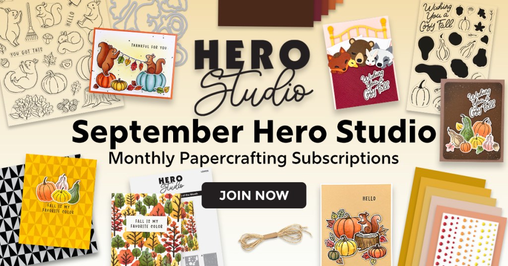The September Hero Studio kits are packed with cozy fall vibes and I can’t wait to share more projects with you. Join me live on my YouTube channel each week for more card making tutorials and a few tips.