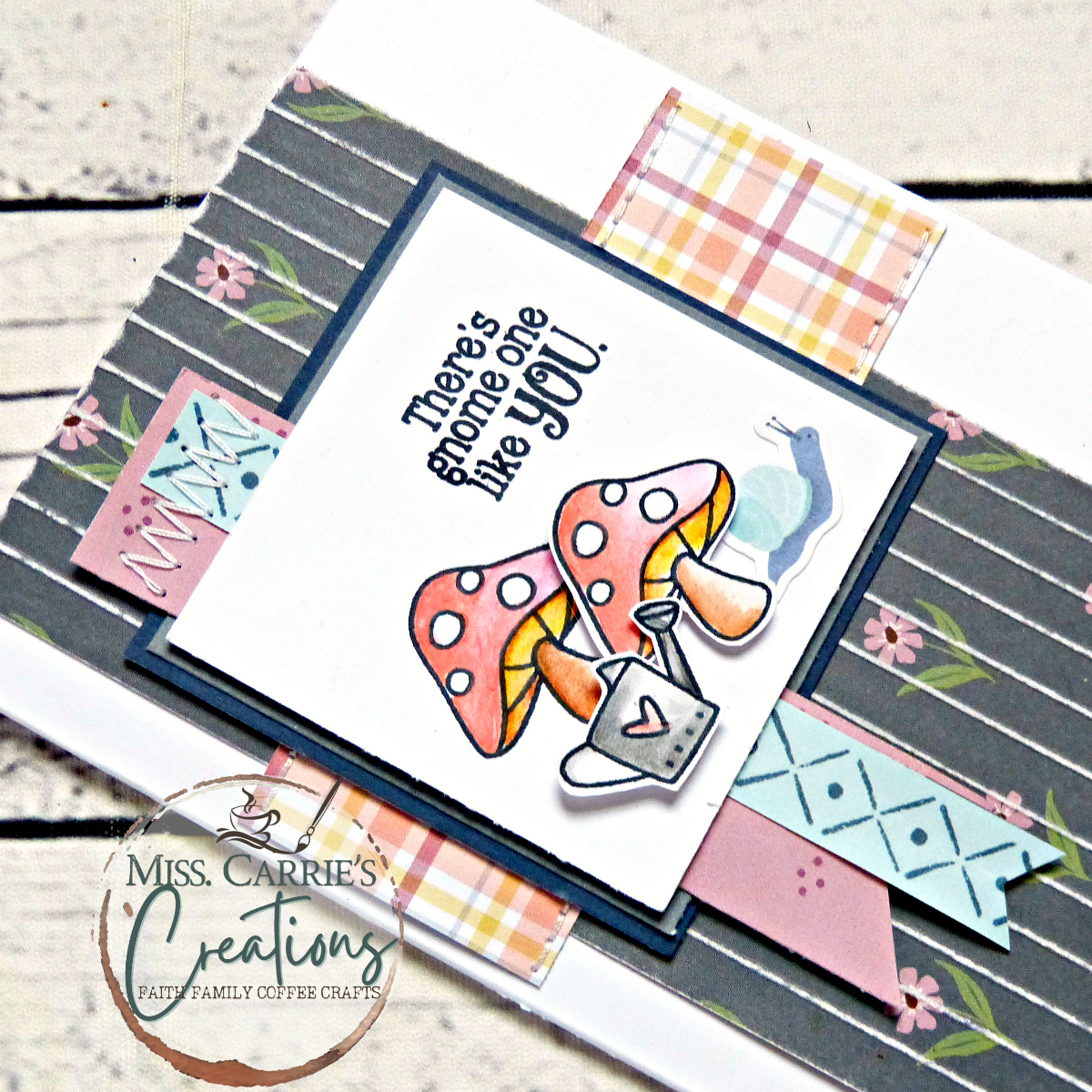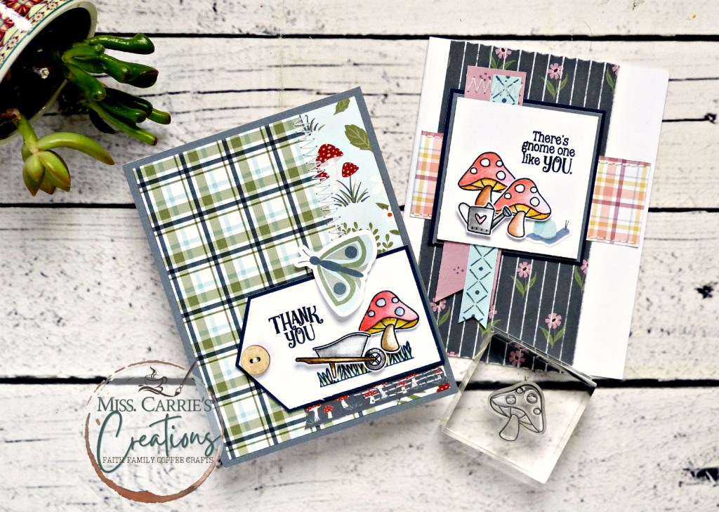 The second card was created using a variety of layered paper patterns and a mini-garden scene. The mushrooms and watering can were shaded with watercolor pencils then layered together with a snail sticker.