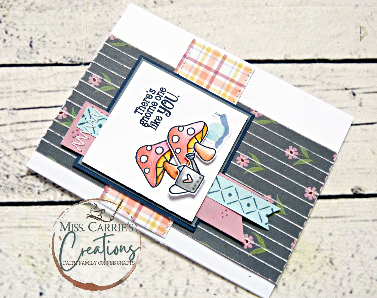 So…. I really had to giggle when I won this mini garden gnomes stamp set at virtual convention. If you have watched me on Craft Roulette, you know that I am not a fan of gnomes. Give me a fairy, a brownie, a troll, even a pixieโฆ.but gnomes are not my favorite.