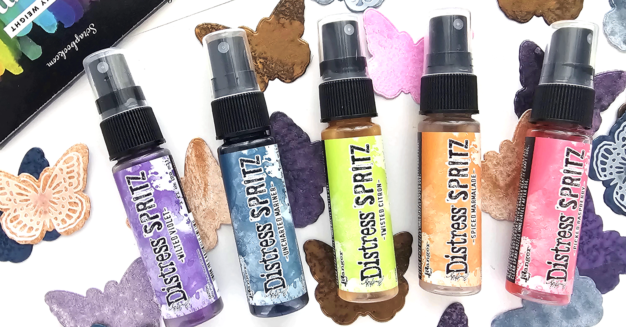 You cannot imagine all the fun I have with the new Distress Spritz by Tim Holtz for Ranger Ink and I can’t wait to share more projects with you. With the Distress Spritz, your projects will shimmer with brilliance.