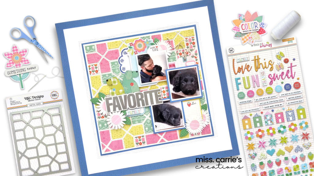Using the Modern Quilting Block background die from Hip Kit Club kit, I transformed a die designed for card makers into a full quilt-inspired scrapbook layout. This quilt scrapbook layout is a wonderful example of how you can adapt tools you may already own.