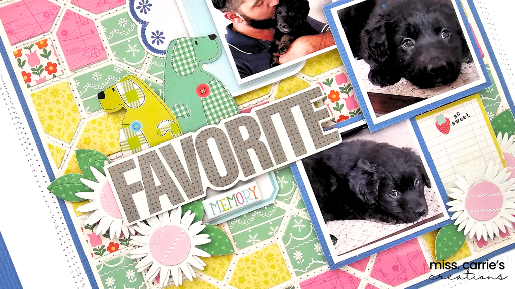 When it came to embellishments, I intentionally kept things simple. Instead of filling the page with lots of layers, I created three small clusters that repeated shapes and colors across the layout. A few stitched tags, soft florals, enamel dots, and two playful green puppy die cuts were all I needed to tie the design together.