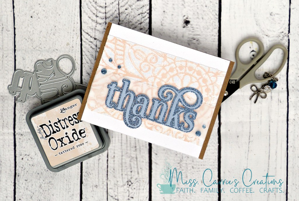 This simple thank you card was created using Diamond Stickles and Transparent Gloss Texture paste with one of our new 12-inch stencils. Don’t you just love that Tattered Rose background? It reminds me of old world tiles.