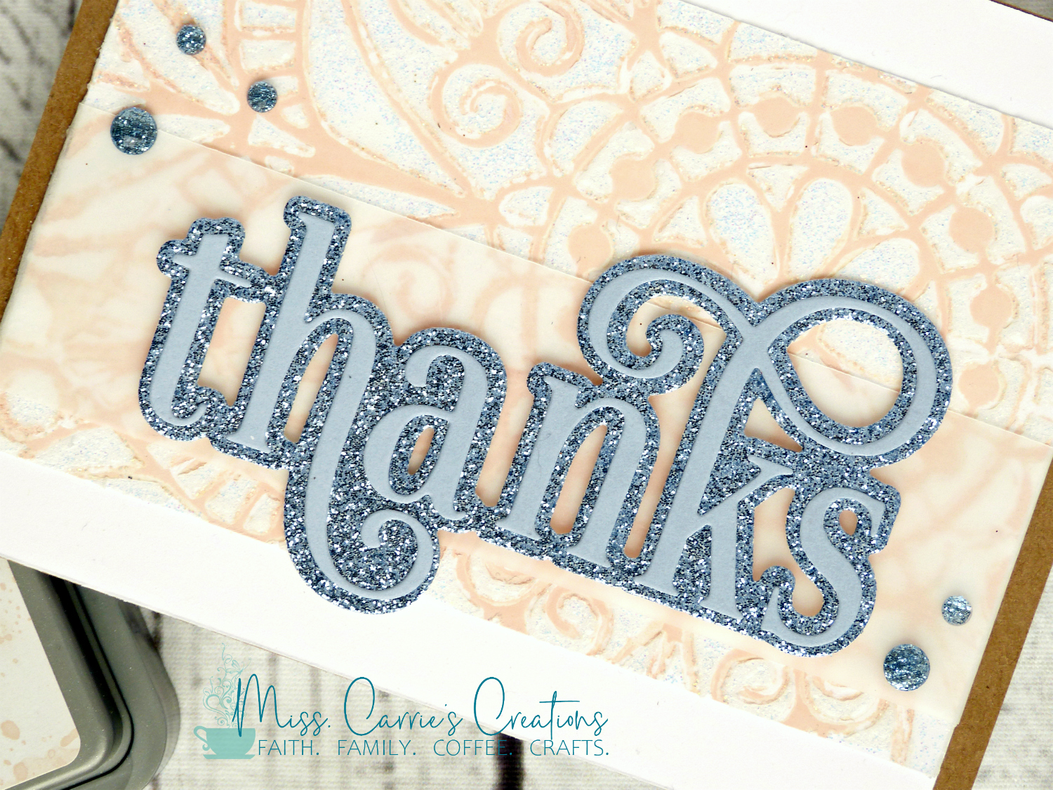 The sentiment was cut out of both Blue Belle glitter paper and Blue Belle cardstock using the Thanks Thin Cuts. These two dies are designed to layer atop each other to create the sentiment and a shadow layer.