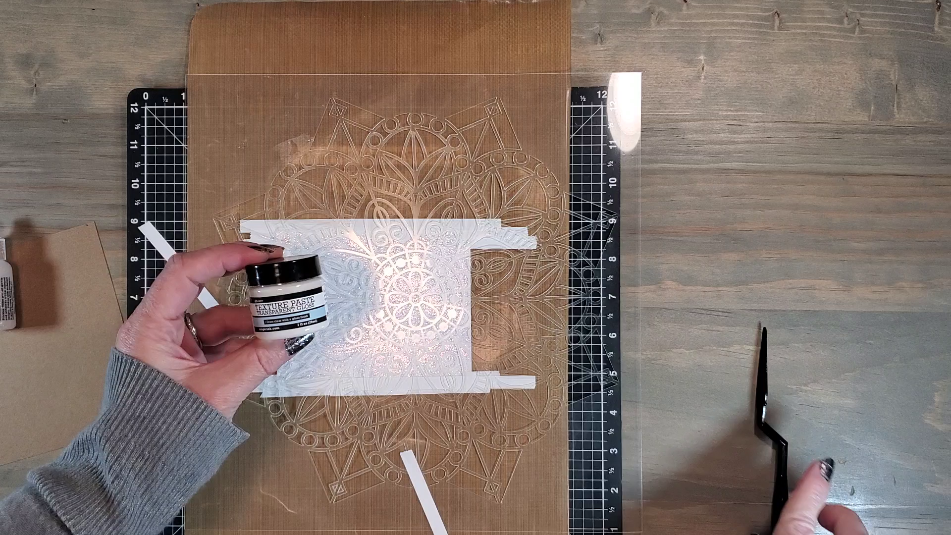 After adding the stenciled stickles (say that fast five times), I built up the background using Transparent Gloss texture paste to create the look of etched tiles. When I first applied the paste, it appeared as if all the glitter from the Stickles was going to disappear, but once it dried, I had a beautiful sparkling background.